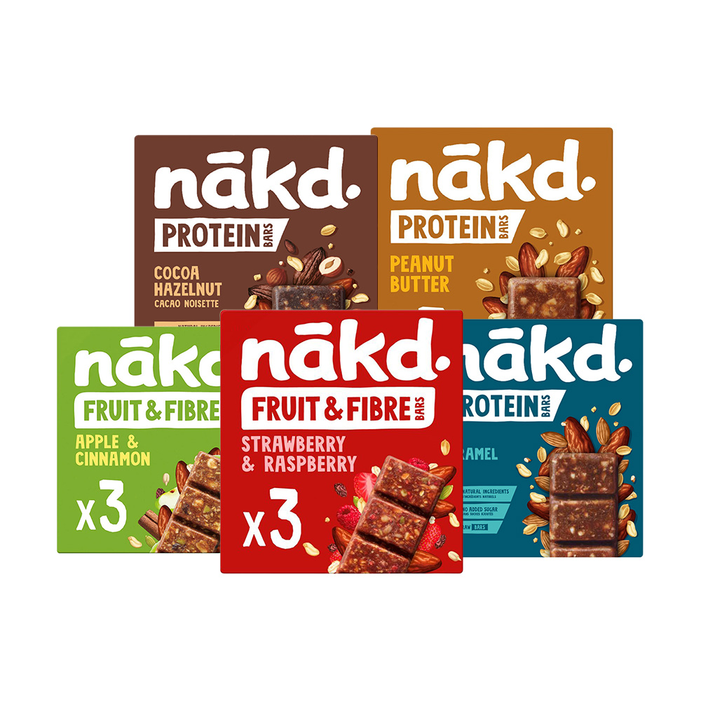 Nakd BarsApple & Cinnamon Fibre, Caramel Protein, Cocoa Hazelnut Protein, Peanut Butter Protein, Strawberry & Raspberry Fibre